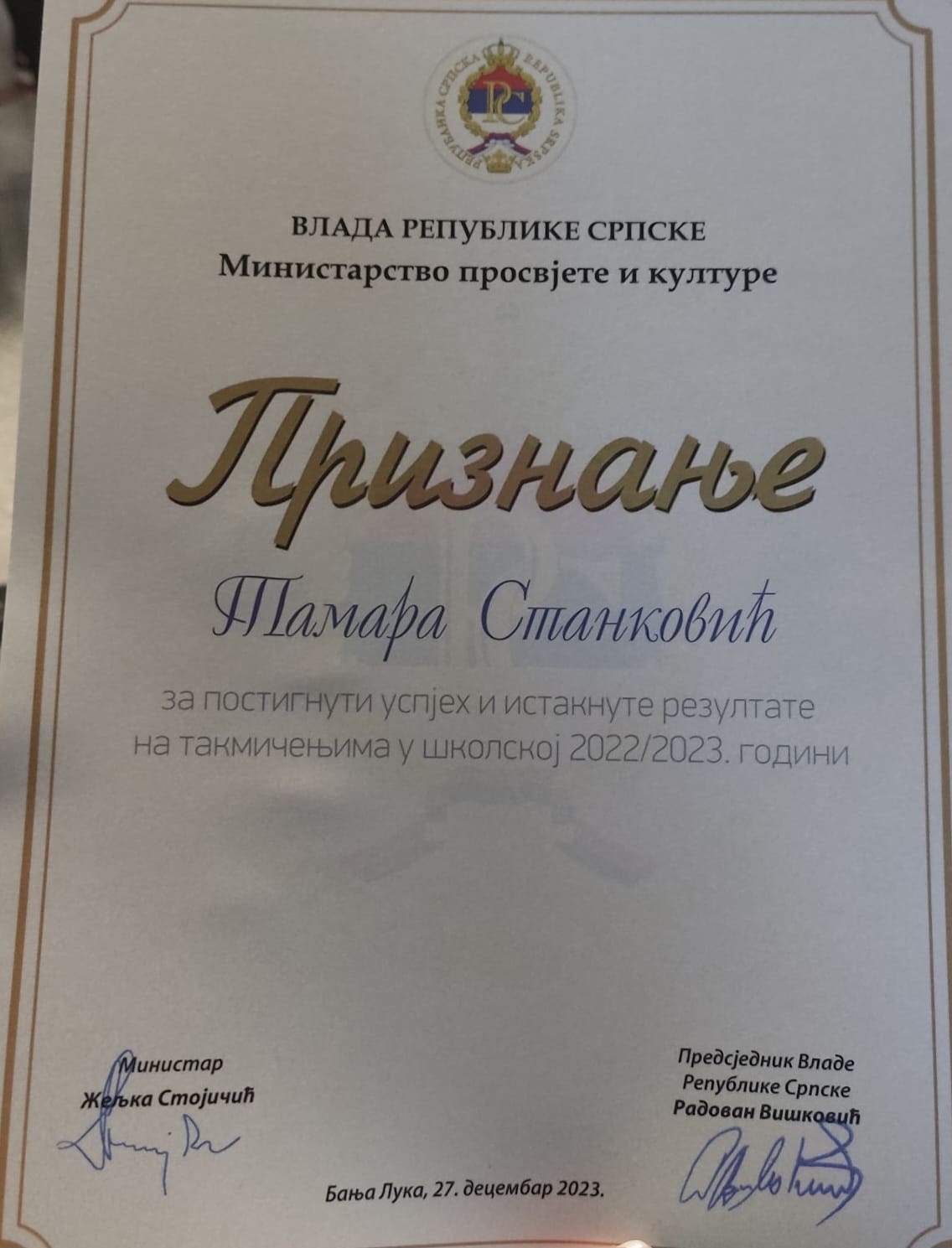 Тамара Станковић, из Ђулића код Теслића, је као најбољи ученик веронауке у Републици Српској, затим члан нашег центра за талентоване ђаке ”Гнезда” и полазник образовне ескурзије најбољих ђака из Региона: ”Стопама наших предака”, на позив Министарства просвјете и културе Републике Српске са својом наставницом православне веронауке, Стојанком Никчевић, присуствовала свечаном пријему за ученике победнике републичких такмичења и учеснике међународних такмичења. За њу и за још 45 најбољих њених вршњака, ученика основних и средњих школа, победника такмичења на нивоу БиХ и на међународном нивоу, те других такмичења која је организовао Републички педагошки завод у школској 2022/2023.години, Министар просвјете и културе Републике Српске Жељка Стојичић, уручила је признања. Поред признања, ученицима је уручен и поклон бон који могу искористити у књижарама Завода за уџбенике и наставна средства Источно Сарајево.